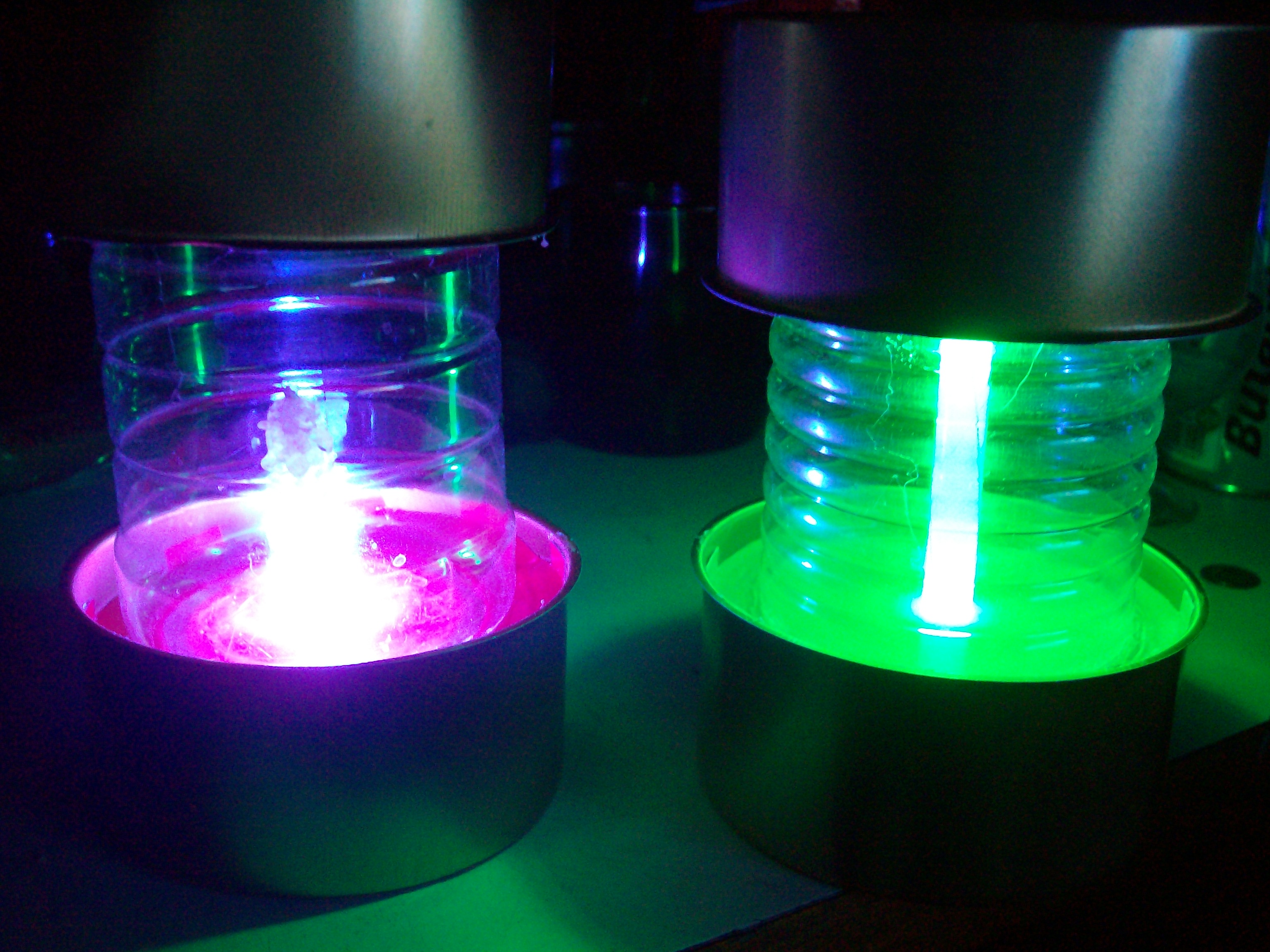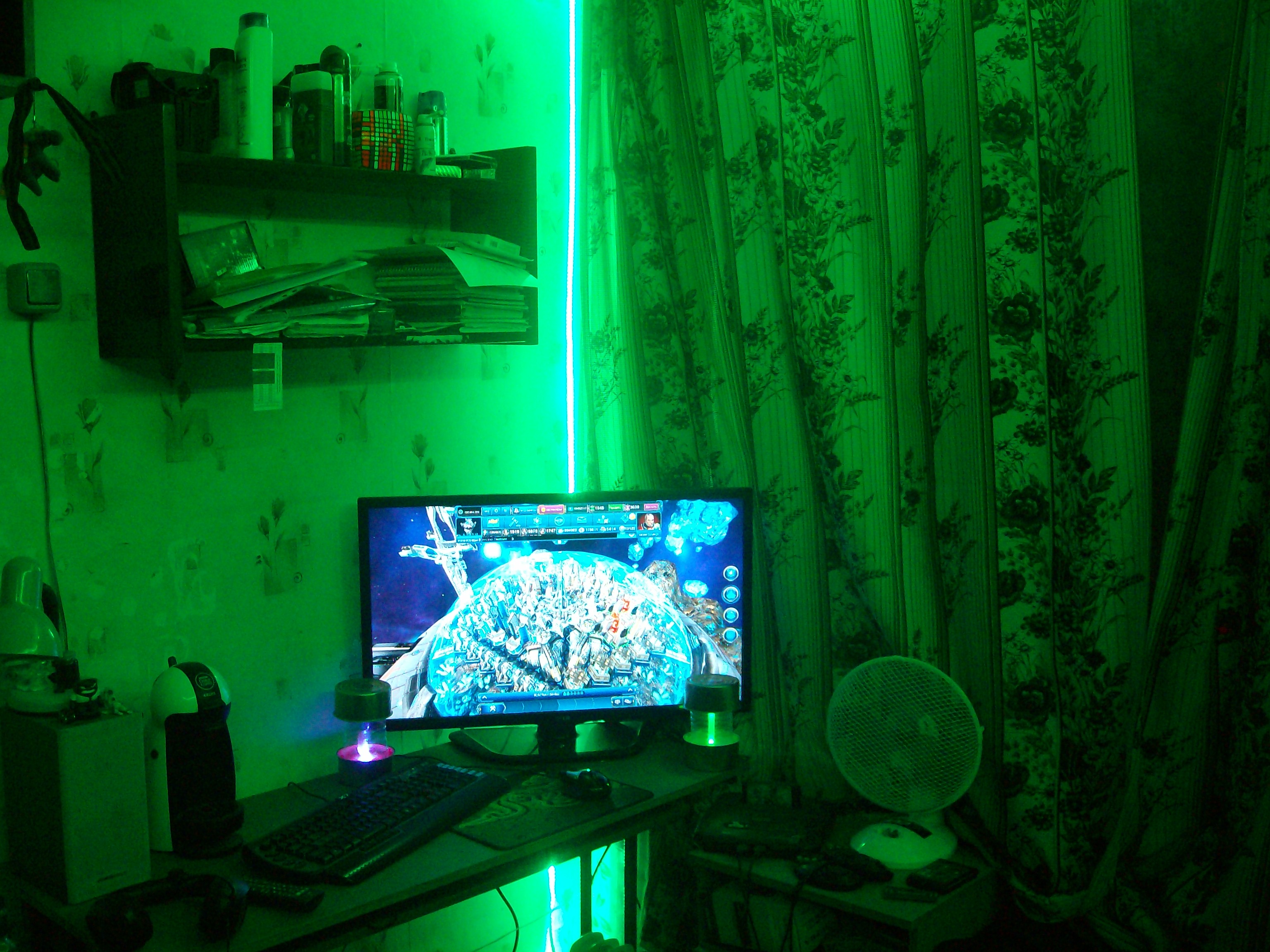 На первом фото мое игровое место, по краям хэнд мэйд светильники "Тритий" и "Дейтерий". Далее идет фото их с близкого расстояния. На третьем фото включена зеленая подсветка комнаты, ощущения как будто находишься в тритиевом облаке. И последнее фото фото с улицы с включенной зеленой подсветкой.