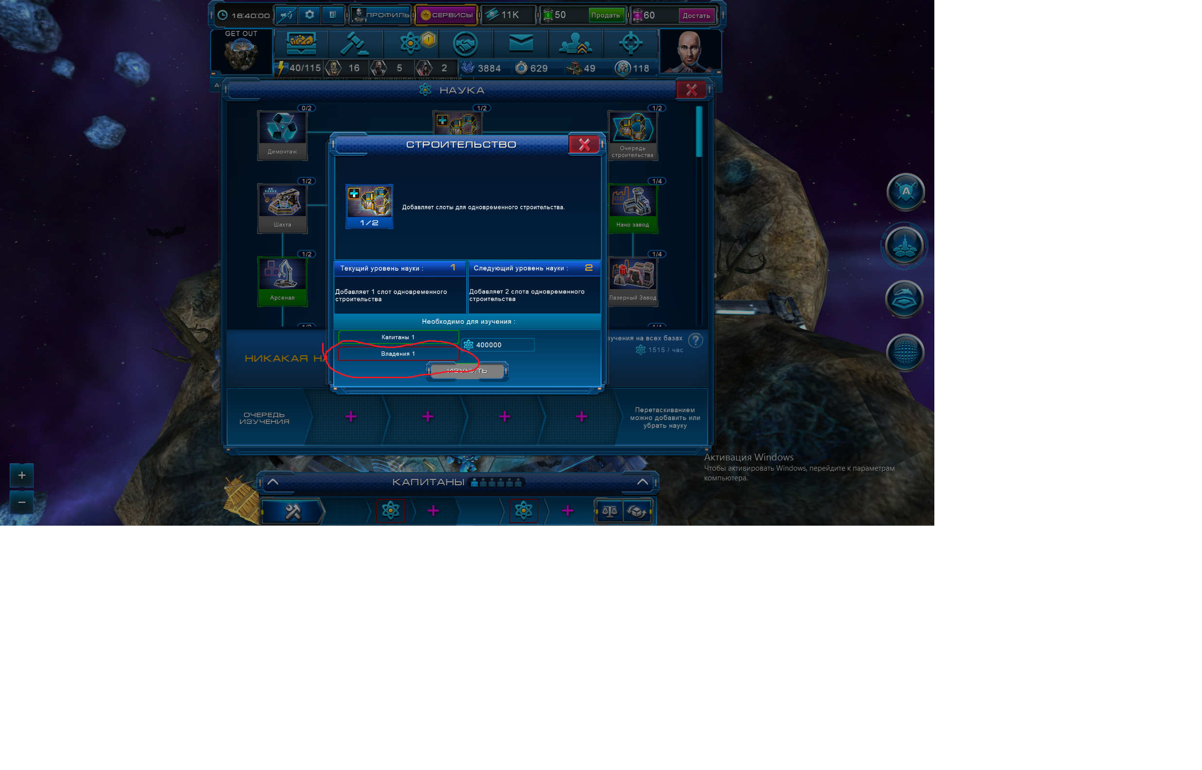 ]В игре я недавно и не могу понять одну вещь связанную с наукой Строительство. у меня есть квест апнуть науку до 2 лвла но не могу потому, что подсвечивается Владение 1 красным цветом .Что это такое?