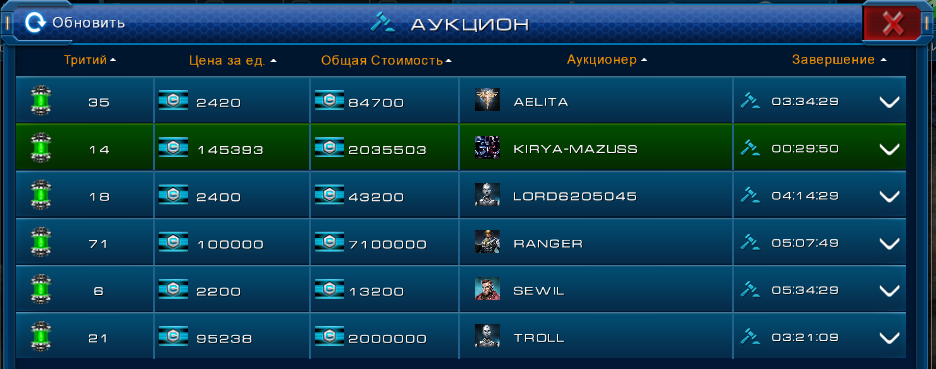 Вы также можете перебить чью то ставку. Лучше это делать тогда, когда завершение лота подходит к концу. В этом случае к нему добавиться еще 30 минут. Если за это время никто не перебьет вашу ставку, то Тритий зачислится на ваш счет, а общая стоимость лота спишется. Если ставку снова перебили, то завершение лота опять вернется на 30 минут, а потраченные кредиты на ставку возвратятся на ваш счет.