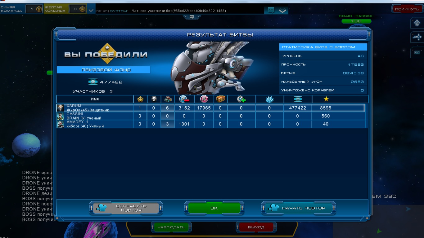Причем зашли сразу в 2м и просто вмсятку команду пришельцев :) - реплей есть :) - я понял ученик перспективный, 100 хп кораблик и так по-боевому :). Но затишье - на арене крутиться босс 29 и 46 уровней еще час - а делать нечего. И тут, думаю какая разница у меня есть супер защитник 45 - главное координация - недолгие приготовление в скайпе (ученик кстати набрал на все свои 20 боезапаса - щитов и барьеров :). И: